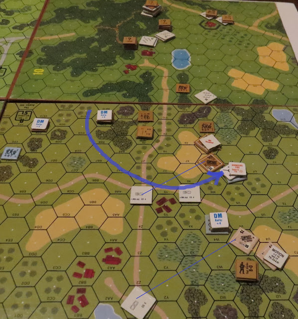 In the north, my mounted troops headed into the woods. In the south...the arrows tell the story of my boys trying to destroy a single half-track.