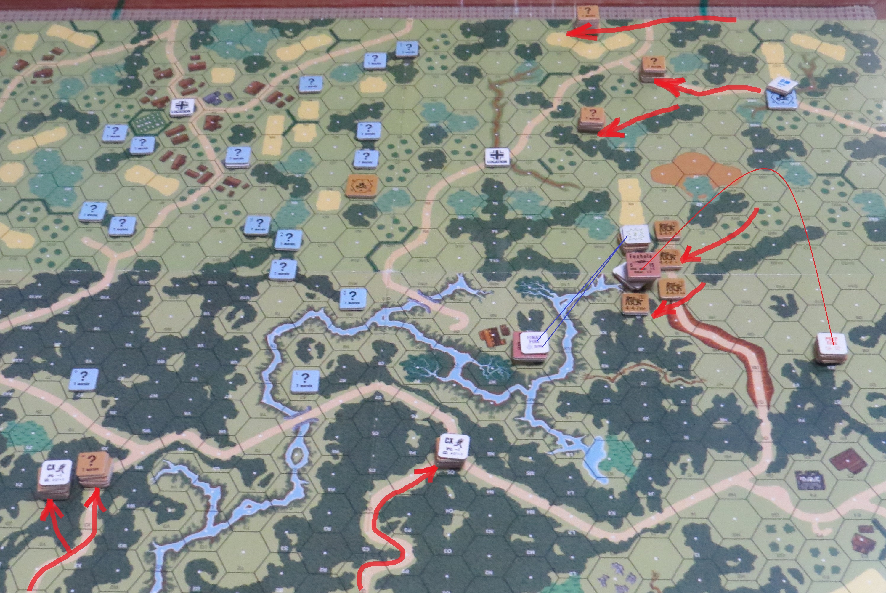 Turn 4 would see strong advances all along the front as my three groups came together. The bridge had been taken and it was time to focus on the victory buildings.